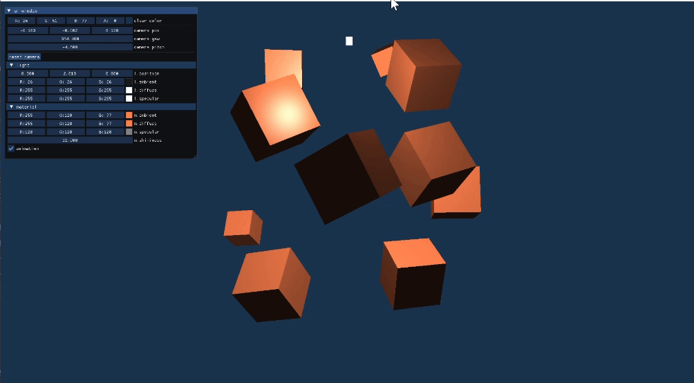 ImGui를 사용해 조명 및 물체의 재질 속성을 실시간으로 변경할 수 있는 UI를 구현했다. UI에서 값을 조정하면 실시간으로 조명 효과가 반영된다.